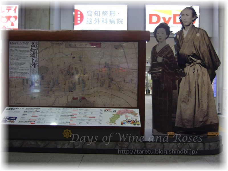 駅構内には、龍馬とおりょうさんのカップルのパネルが。高知城下のどこにいけばよいのかを教えてくれます。