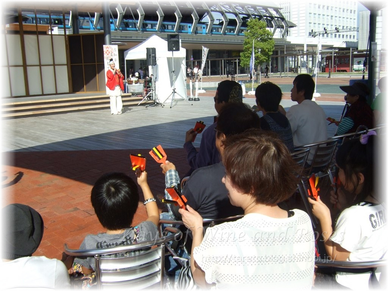 食べながら演舞を楽しんでいるうちに、何故かおねえさんたちが鳴子を配ってました。写真撮影のために私もひとつください。