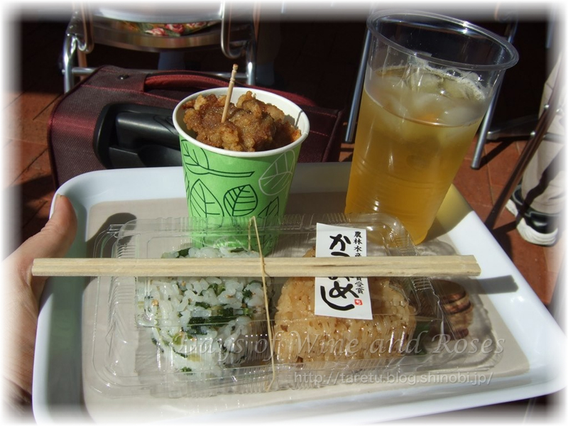 目移りをしながらも高知のカツオ飯と菜飯のおにぎり。地鶏のからあげ。それに冷たいお茶。