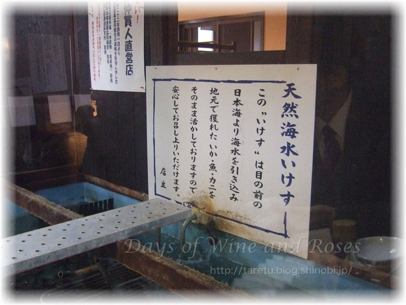 なんとこのいけす目の前の日本海から海水を引き込んであるんだそうです。魚は大海といた時とほとんど変わらない環境で、料理されるのを待っているわけで。うん、鮮度が違うんだろうね。