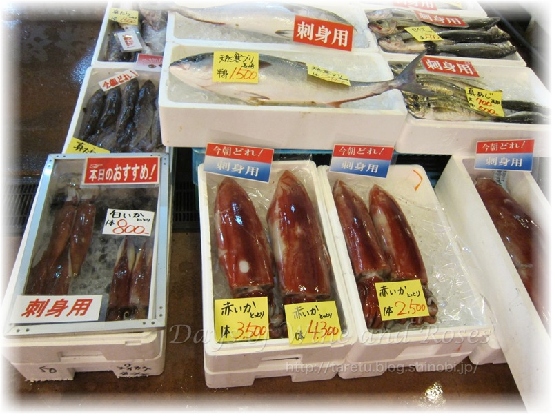 季節のイカ類、赤イカと白イカの両方があるんだそうです。めっちゃでかい。でかいからいいお値段しますね。