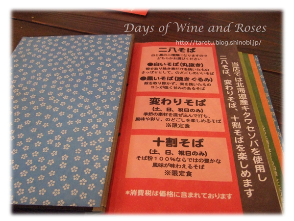 蕎麦は三種類、二八蕎麦(小麦粉2 蕎麦粉8の割合の蕎麦)は白い丸抜きと、黒い挽きぐるみとの二種類。素材を練り込んだ変わり蕎麦。蕎麦粉100%の十割蕎麦。
