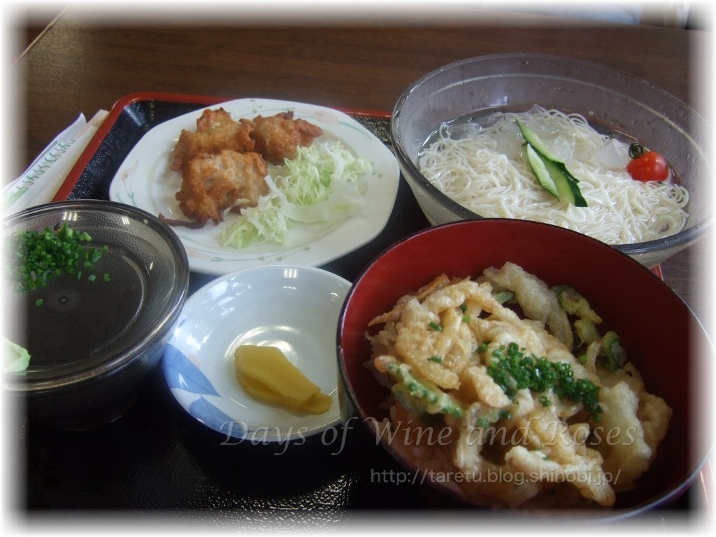 お勧めの品となっていた素麺定食。素麺と小さな天丼と小鉢がついて500円です。良心的というか、生産地の市場ならではの価格でずよね。