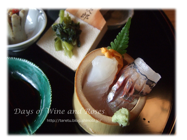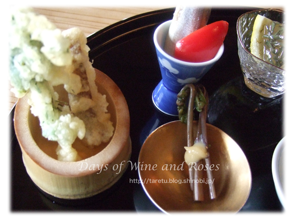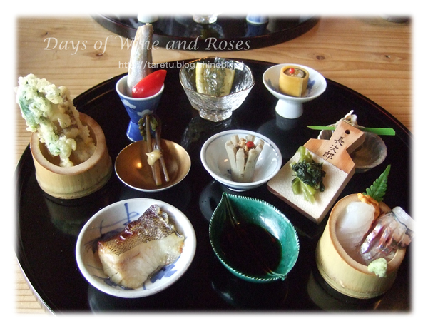 膳の中味は、鯛とかんぱちのお刺身、野沢菜、たたきゴボウ、わらび、山菜の天ぷら。鰆のみそ漬け。ジュンサイのジュレなどなど。