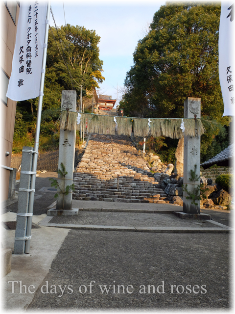 神社の側までくると長い長い石段。そのサイドに舗装された坂道もあるので、行きは石段、戻りは道路と決めて登りました。