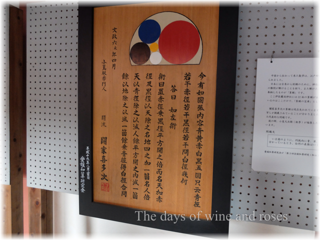 さて、伊佐爾波神社には多数の算額が残っているそうです。算額とは、和算の問題・図・解答、それを導く最終計算式などを記入した額のことで。神社に奉納し、互いに問題を出したり解答したりをするものです。冲方丁の時代小説「天地明察」にもでてきました。