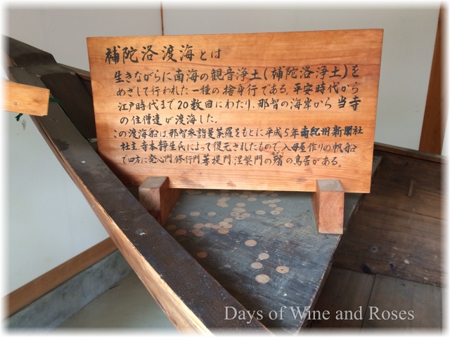 補陀落渡海に使用された船の模型が展示されていました。現代人にとっては仏僧が乗る船なのに、鳥居があるのが奇妙に感じられますが、当時は神仏混淆の時代。仏は熊野の神の現し身、ということでその両者に差はなかったのでしょう。