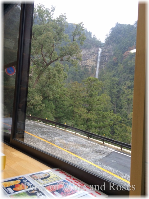 これは別のお店の窓から見える那智の滝の姿。「滝が見えます」と宣伝されているところはこんな感じに見えます。「かいはみ」でも席によっては滝のお姿を拝見しながら食事が出来るようでした。