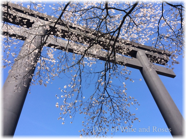 折しも、桜の季節。大鳥居の下、美しい桜が満開を迎え、まるで拡がる裳裾のように彩りを添えています。