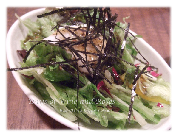 最初はお通しのサラダです。ねばねばとぱりぱりの二種から選べてような。(すみません、覚えていません。)