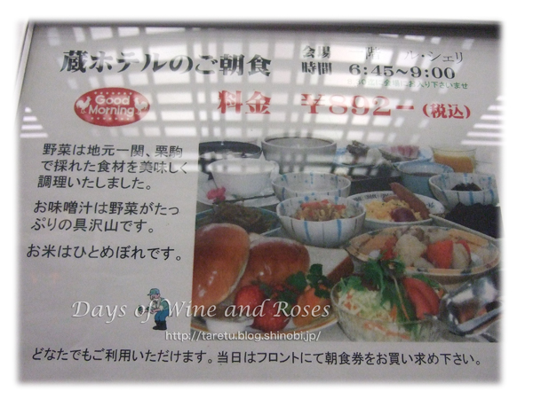 ふと気付くと朝食会場の向こう側に、このホテルの名前の由来らしき蔵が見えました。もっとちゃんと写真が撮りたかったんだけど。機会を逸してしまいました。残念。