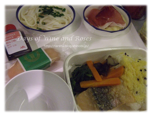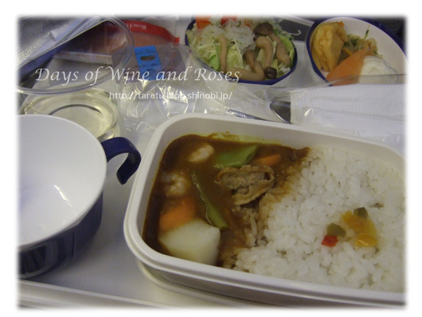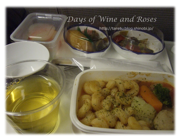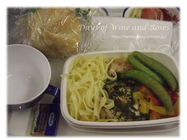 機内食は平麺のパスタ、これもまあ、そこそこ、かな。シーフードカレーよりはよかったです。