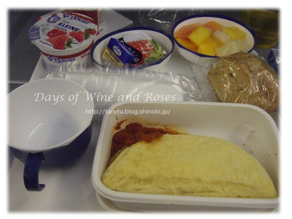 長いフライトの後の、朝食はパスタ。トマトソースベースのさっぱりあっさり系で、これは結構美味しかったです。