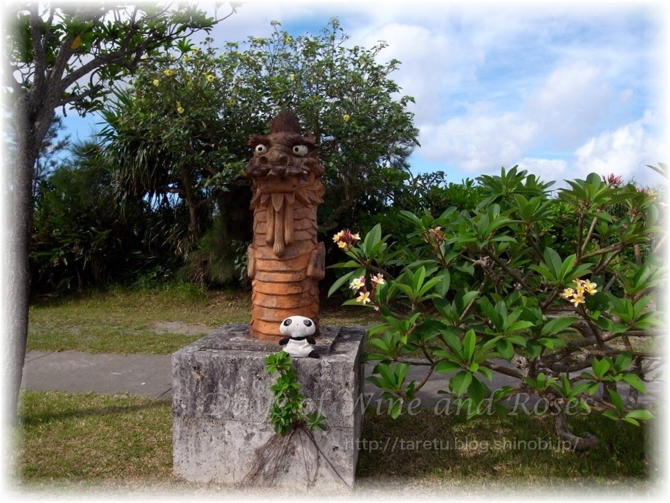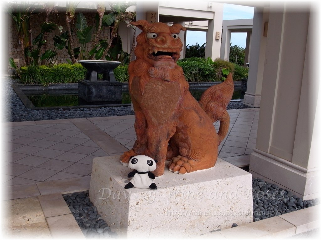 津梁館前のシーサーとたれぱんだ。まだ見学者向けには開いていない時間なので、やりたい放題?