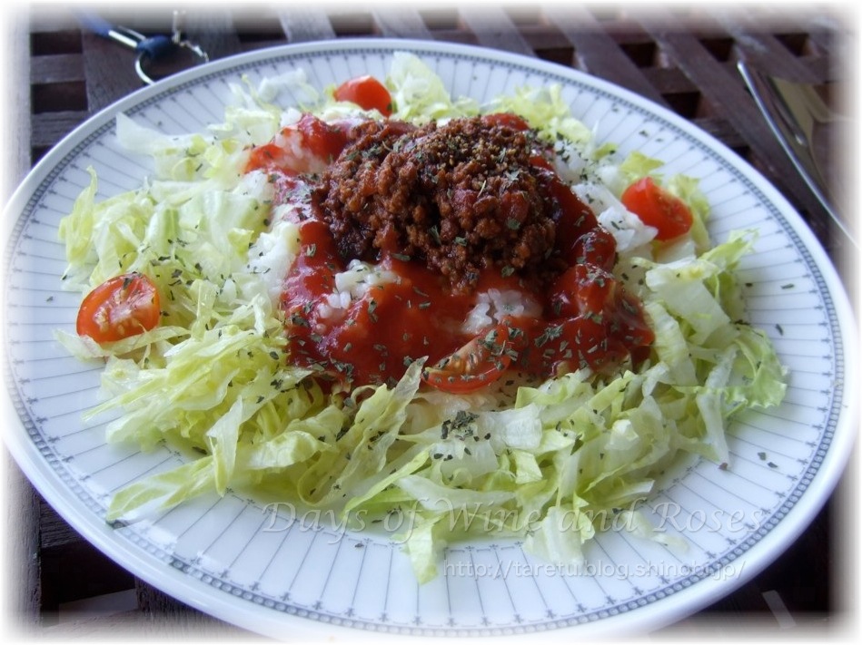 タコライスは沖縄名物のひとつ。タコスの具である挽肉・チーズ・レタス・トマトをご飯にのせたものです。タコスは食べたことがあるけれど、これは初めて。