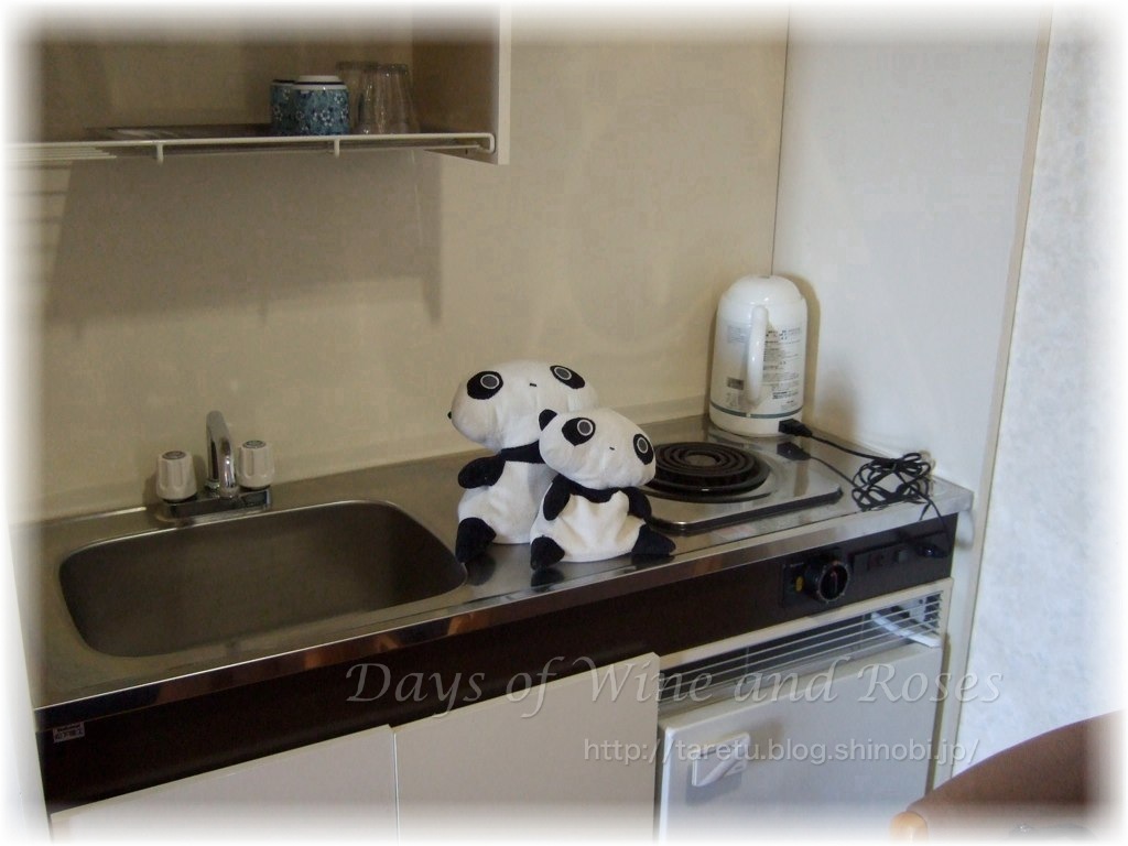 簡単ですがキッチンもついていて、長期滞在者には便利。ただし、近くには大きなスーパーマーケットはないので、いきおい、お向かいのコンビニに頼ることになります。(わずかに野菜なども売っていましたが、本格的に料理できるほどじゃありません)