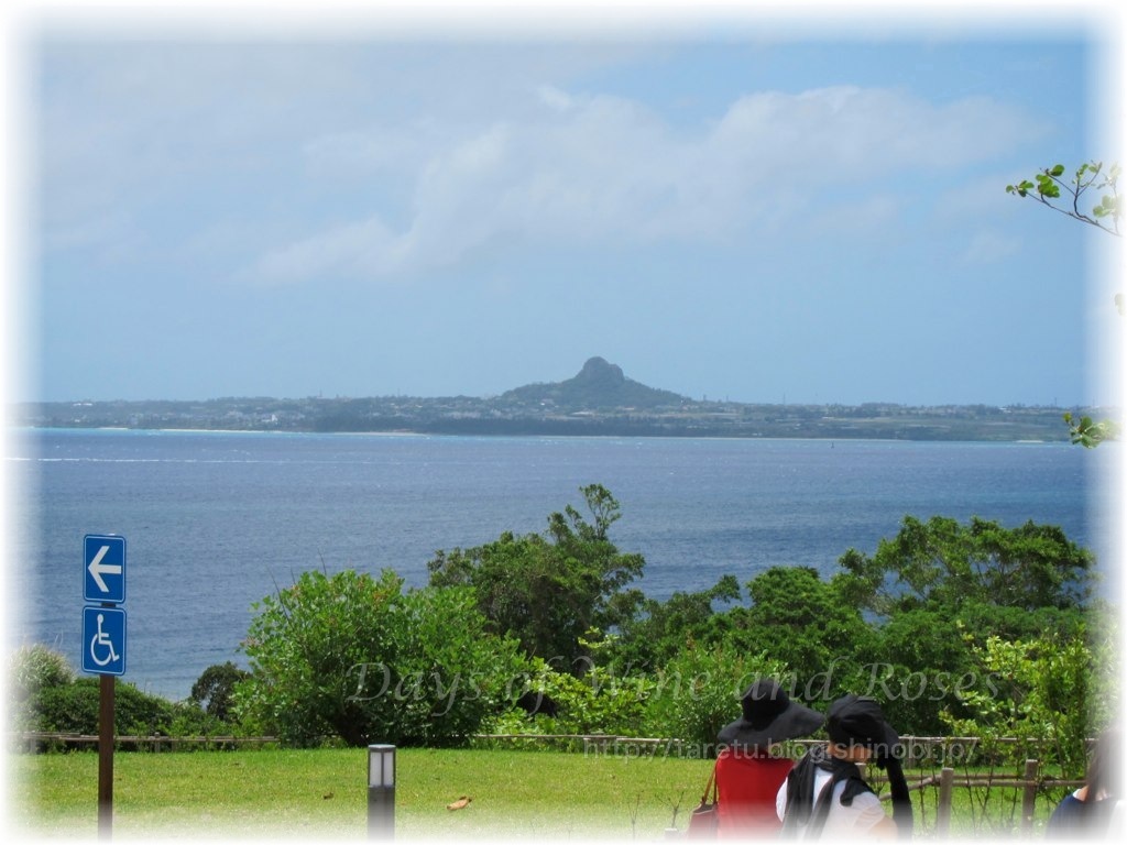 そして目の前にひろがる伊江島と聖地城山(ぐすくやま)。粘性の高い溶岩が盛り上がって出来上がった火山だそうで、昔から航海の目印になっていたんだとか。