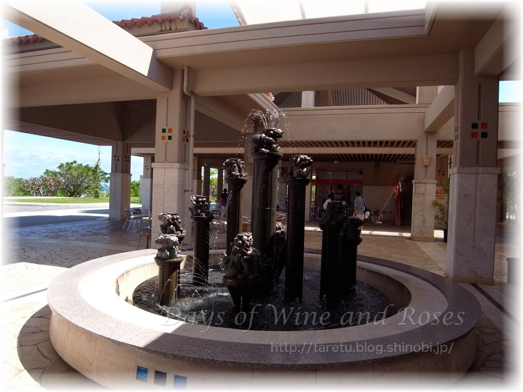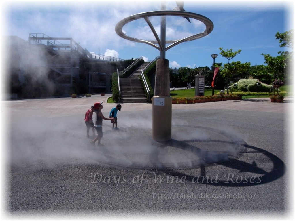 これは、美ら海水族館のすぐそばにあったミスト噴水。入り口からたった5、6分くらいなのですが、強い日光に焼けたコンクリートの道にヘトヘト。ミストが爽やかな風を運んでくれるのが救い。子供たちといっしょにミストの下で騒ぎたい。大人はうらやましげに見てるだけ。