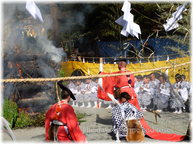 火の前で神事が行われます。ずっと般若心経と祝詞が交互に奏上されています。神仏習合やなぁ。