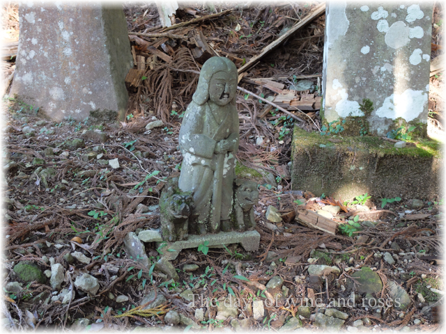 そういった石碑に混じって、ひっそりと立つ可愛らしい神像がありました。みずらに結った童子のような神様の似姿です。どうもそうな狼?を2匹連れています。